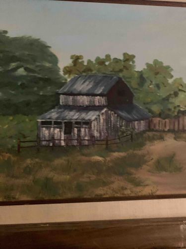 This item is an original oil painting on canvas board, depicting a rustic, weathered barn in a pastoral setting. The composition centers on a multi-level wooden barn with a mix of grey and weathered mahogany-toned siding, topped with sloped rooflines that suggest a corrugated metal texture. The application of paint is impressionistic, utilizing visible, directional brushstrokes to define the grassy foreground and the dense, leafy trees in the background. The color palette is dominated by earthy greens, browns, and ochres, balanced by a pale blue-grey sky. The barn itself shows significant architectural detail, including vertical slatting and dark recesses for windows or doors. The work is housed in a simple, dark-toned wooden frame that appears to have an inner white or pale linen-textured matting border. While no artist signature is immediately visible in the lower corners of the provided image, the style is characteristic of mid-to-late 20th-century American regionalist or folk art schools. The condition appear decent, though the lighting suggests a Slight yellowing of the varnish and possible minor surface abrasions consistent with age. There are no obvious tears or large-scale losses visible, though the frame shows some minor scuffing along the edges.