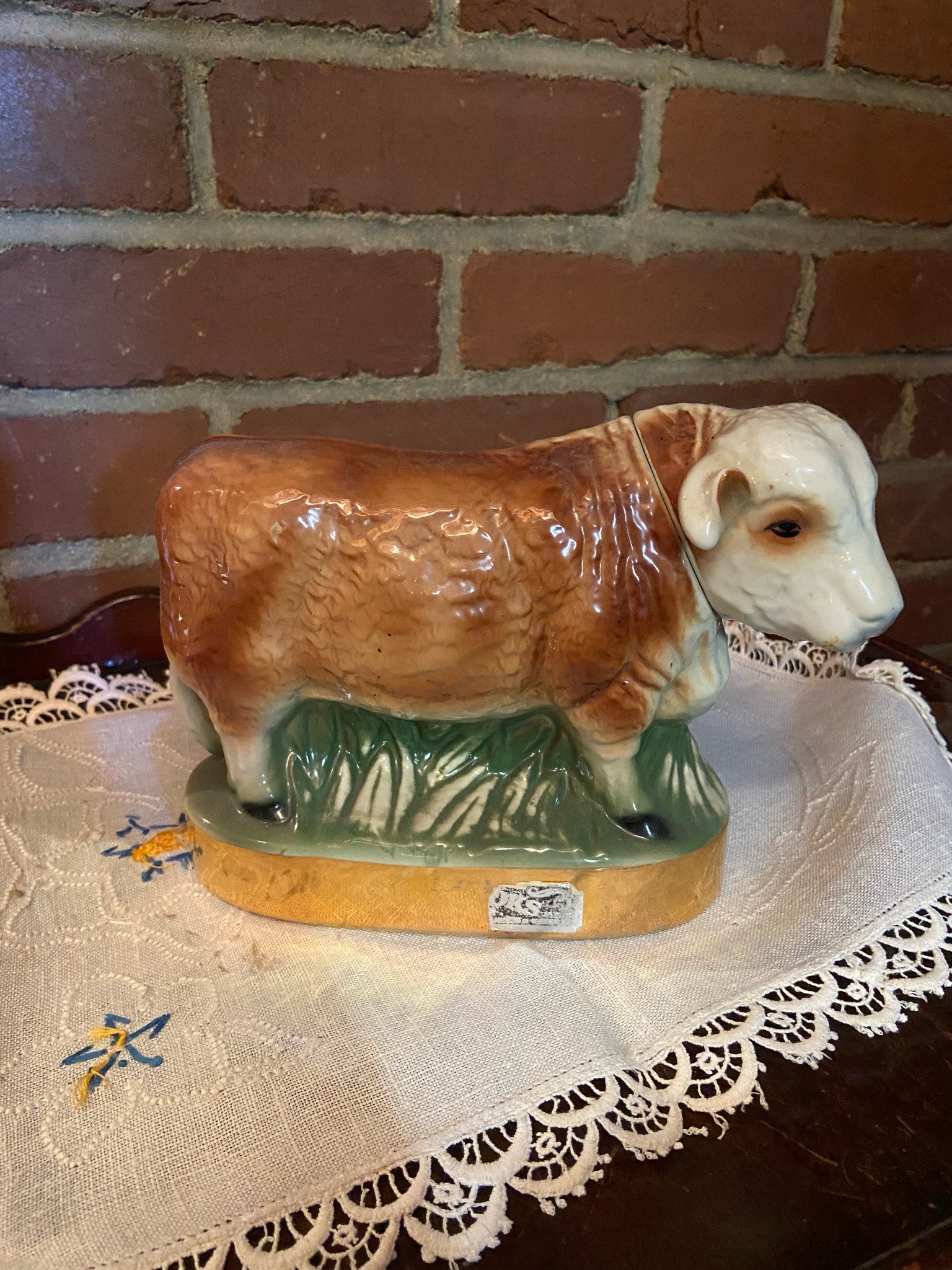This is a vintage ceramic figural decanter depicting a standing bull, likely manufactured by a company such as Jim Beam or a similar spirits producer in the mid-20th century (circa 1950s-1970s). The piece is constructed from glazed earthenware, featuring a distinctive two-toned brown and cream color palette with a textured, molded surface that mimics the appearance of fur and musculature. The bull is shown standing on a grassy green mound, which transitions into an oval base finished with a bright gold metallic glaze. The head of the bull serves as a removable stopper, resting loosely against the neck of the body. Notable features include hand-painted detailing around the eyes and ears. A partially intact paper label is visible on the gold base, which likely originally identified the contents or the manufacturer. In terms of condition, the piece shows moderate wear consistent with age, including a notable gap between the head and body that may indicate a missing cork or gasket. The glaze exhibits some surface scratching, and the gold finish on the base shows minor scuffing. Overall, the craftsmanship reflects a mid-level mass-produced collectible of its era, characterized by its kitsch charm and functional design.