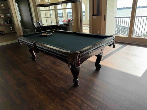 This is a full-sized, furniture-grade billiards table, likely 8 feet in length, exhibiting high-end craftsmanship and traditional design. The table is constructed from solid hardwood with a deep espresso or dark mahogany finish. A defining physical characteristic is the ornate dentil molding detail running along the apron (side panels) and the heavy ball-and-claw cabriole legs, which provide both structural stability and a classic aesthetic. The playing surface is covered in professional-grade forest green felt, appearing in excellent condition with no visible tears or significant chalk staining. The pockets feature leather shielded fringe or decorative tassels, a hallmark of traditional pool table styling. A circular brass or metal medallion is visible on the top rail, which likely contains the manufacturer's mark. The rails are solid wood with inlaid diamond-shaped sights for aiming. This piece reflects a late 20th to early 21st-century manufacturing style, designed to be a centerpiece in a luxury home game room. The condition appears near-mint, with the wood finish retaining a high luster and no obvious abrasions or structural wear. The overall quality of the joinery and the depth of the carvings suggest a premium manufacturer such as Brunswick or Olhausen.