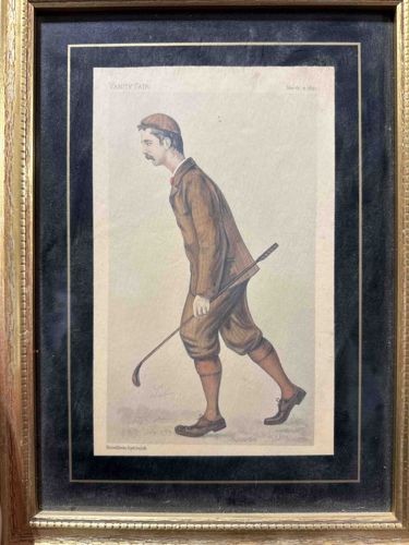 This is an original color lithograph portrait from the Victorian-era British weekly magazine 'Vanity Fair'. Dated May 19, 1890, the print features Horace Hutchinson, a prominent amateur golfer and prolific writer on the sport. The caricature, titled 'Hoyle' or 'The Champion Golfer', shows Hutchinson in a distinctive slouched posture, dressed in period-accurate golfing attire including a brown Norfolk-style jacket, knickerbockers (plus-fours), a small rounded cap, and long wool stockings. He is depicted holding a hickory-shafted golf club. The print bears the magazine's title 'VANITY FAIR' at the top left and the original publication date at the top right. A signature or artist monogram, likely 'Lib' (Liborio Prosperi), is visible in the lower left of the image area. The lithograph is presented in a sophisticated double-matted frame. The outer mat is a deep navy blue velvet or suede-texture material with a gold fillet border, which complements the glided wood frame. The frame itself shows some minor age-related wear and dust accumulation. The paper of the lithograph exhibits characteristic light toning and minor foxing consistent with a 130-year-old piece of ephemera. The colors remain relatively vibrant, suggesting it has been kept out of direct sunlight. The craftsmanship of the printing is high, utilizing the chromolithography process popular in the late 19th century to achieve subtle gradients and a painterly feel.