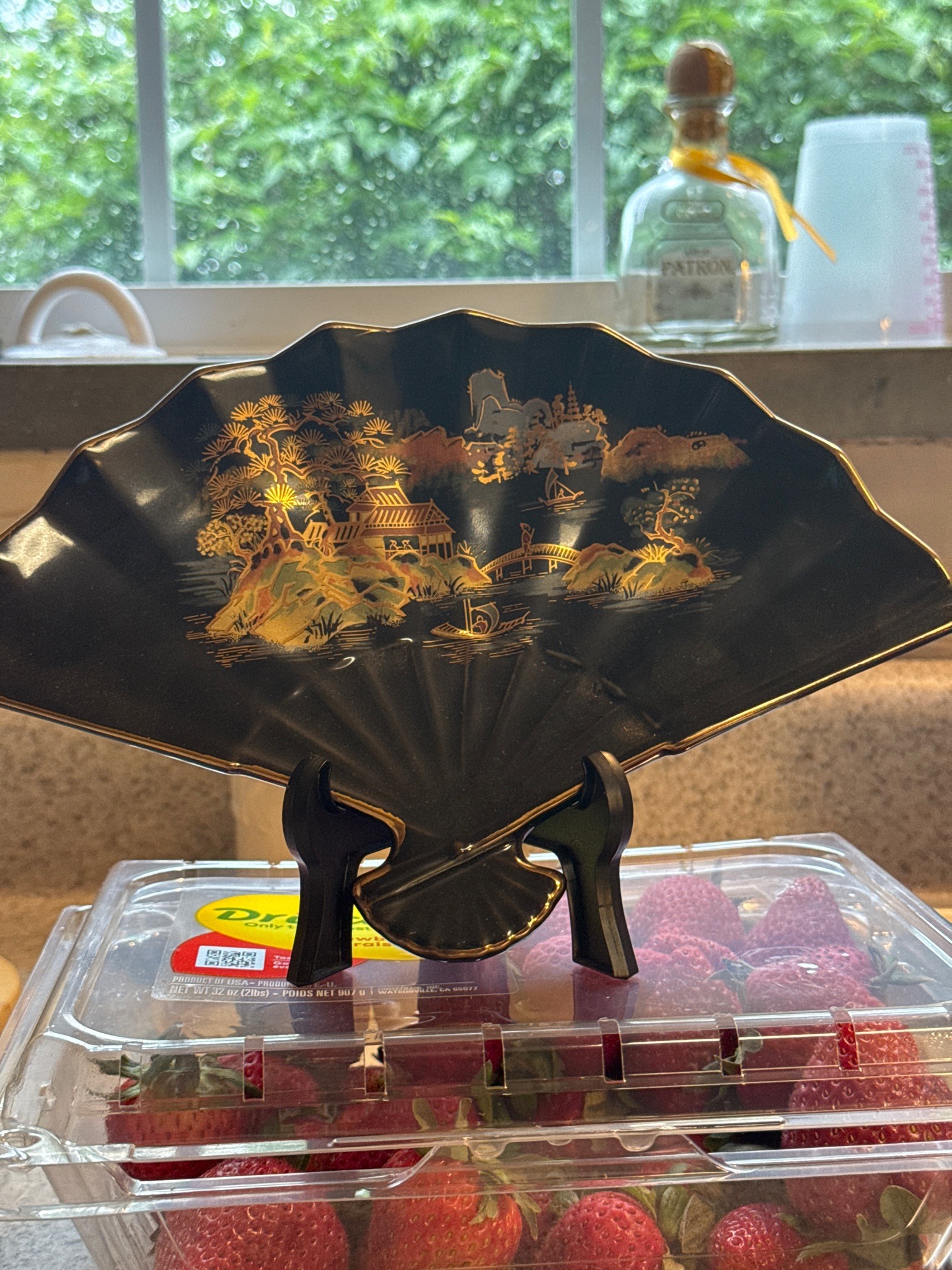 This item is a decorative porcelain display dish or trinket bowl fashioned in the shape of a traditional folding hand fan (sensu). The piece is constructed from high-fire ceramic with a lustrous black glaze finish, likely of Japanese origin given the 'Chinoiserie' or 'Showa-style' aesthetic common in mid-20th-century giftware (circa 1950s–1970s). The surface features a detailed hand-painted or transfer-applied landscape scene in metallic gold and copper-toned gilding. The scene depicts a serene lakeside village with a traditional pagoda, a high-arched moon bridge, pine trees, rowing boats, and distant mountains. The edges of the fan and the bottom 'pivot' point are accented with a fine gold rim. This piece is currently presented on a black plastic display stand. The craftsmanship displays smooth scalloped edges and molded ridges that mimic the physical folds of an actual paper fan. The condition appears to be excellent with no visible cracks or chips, though minor shelf wear on the bottom and slight thinning of the gold gilding on the high-contact rim points are typical for an item of this vintage. The high-gloss finish provides a deep reflection, often associated with makers like Otagiri or similar porcelain manufacturers from the Seto or Arita regions of Japan.