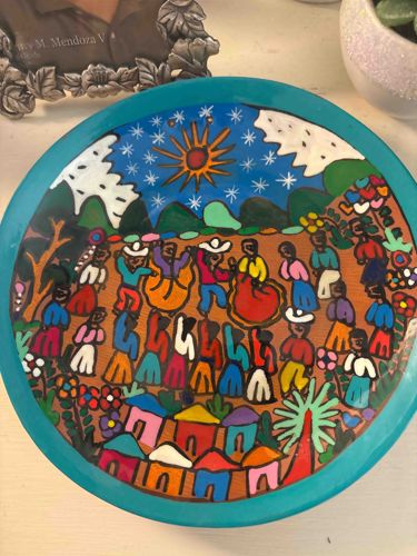 This is a circular decorative ceramic plate featuring a vibrant, hand-painted folk art scene, likely of Mexican origin (Guerrero or similar region). The piece is approximately 10 to 12 inches in diameter and is executed on a clay or earthenware body. The design depicts a celebratory village scene with numerous figures in traditional attire dancing outdoors beneath a celestial sky featuring a radiant sun and white stars. Below the dancers, a row of colorful, stylized houses with gabled roofs anchors the composition. The artwork is characterized by bold primary colors, thick black outlines, and a high-gloss glazed finish. A wide, solid turquoise-blue border frames the central narrative. Notable features include the intricate, naive style of the human figures and the use of white 'cloud' motifs at the upper corners. The condition appears excellent with a high-luster glaze, no visible cracks or chips from the front, and uniform color saturation. The craftsmanship displays the charming, non-perspectival style typical of regional artisanal cooperatives from the mid-to-late 20th century.