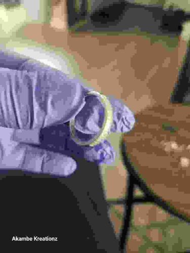 This item is a circular band ring, likely a wedding band or a high-end fashion ring, crafted from a yellow-toned metal, typically 14k or 18k yellow gold based on the saturated hue. The ring is being held by a gloved hand, suggesting a focus on preservation and professional handling. The exterior of the band appears to have a textured or pav©-set surface; though the image resolution is low, there are visible glints and variations in the surface that suggest either a continuous row of small inset gemstones (such as diamonds) or an intricate milgrain/diamond-cut finish. The interior of the band is smooth and polished for comfort. There are no visible maker's marks or stamps from this angle, but the uniform width suggests a precision-manufactured eternity style or semi-eternity style band. Regarding condition, the metal retains a high luster without obvious scratches, deep gouges, or warping, indicating the structural integrity is intact. The modern aesthetic and clean lines suggest a contemporary 21st-century production. The craftsmanship appears to be of high quality, characterized by even proportions and a seamless circular form, which is a standard indicator of professional jewelry smithing.