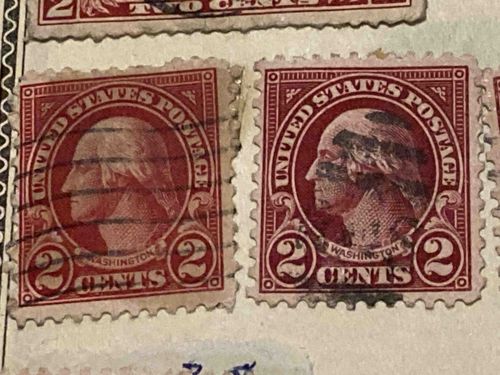 Shown are two examples of the United States 2-cent red postage stamp featuring the profile of George Washington. These stamps are part of the long-running Washington-Franklin Series, typically dated between 1908 and 1922. The design consists of a central medallion with Washington's profile facing left, encircled by 'UNITED STATES POSTAGE' and flanked by the numeral '2' in bottom corners within decorative scrollwork. The color is a deep carmine or rose-red on off-white paper. Physically, the left stamp shows horizontal wavy-line machine cancellations, while the right stamp features a heavier, darker smudge-style postmark over Washington’s face. Regarding condition, the stamps exhibit typical characteristics of circulated philatelic material: the perforations on the left stamp are irregular and slightly worn at the top and bottom edges, and the centering is moderately off to the left. The paper shows slight toning consistent with age. Both stamps appear to have been previously hinged or mounted. These stamps were produced by the Bureau of Engraving and Printing using the flat plate or rotary press process; specific identification would require measuring perforations and checking for watermarks to determine the exact Scott catalog number (e.g., #406, #407, #499, or #527), which significantly affects rarity.