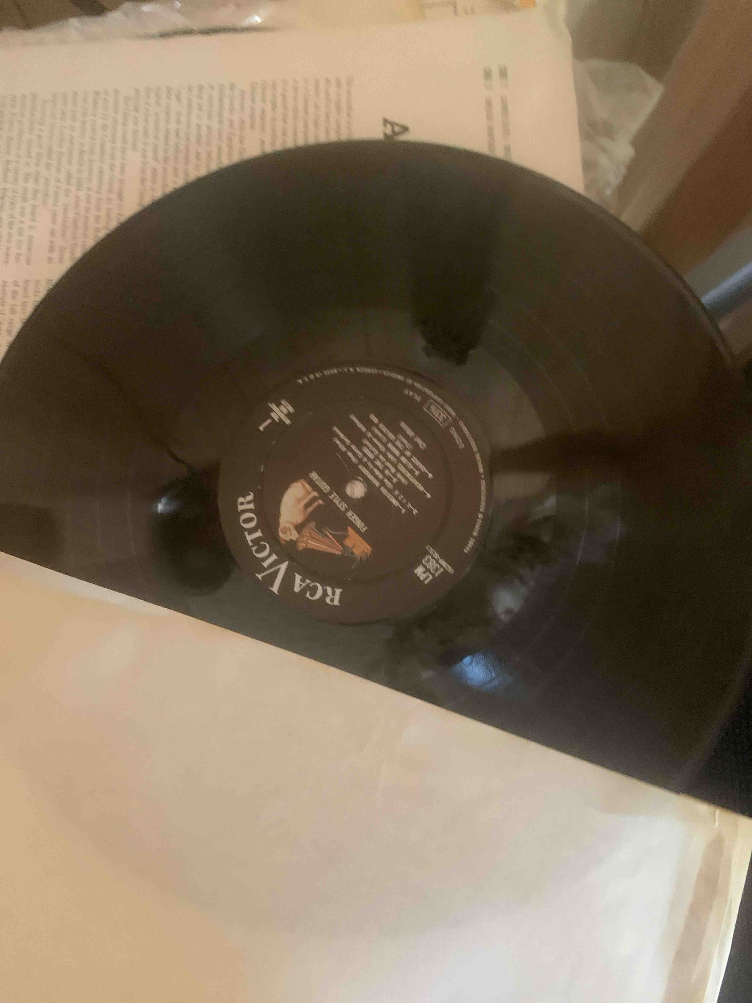 This is a 12-inch Long Play (LP) vinyl record titled 'Finger Style Guitar' by Chet Atkins, released under the RCA Victor label. The physical item consists of a black polyvinyl chloride (PVC) disc featuring standard microgrooves for 33 1/3 RPM playback. The central paper label is the iconic RCA Victor 'Nipper' dog design on a black background with silver and white text, indicative of an early-to-mid 1950s 'Shaded Dog' or 'Long Play' label variant. The catalog number 'LPM 1383' is clearly visible. Physically, the vinyl appears to have some light surface scuffing and dust, which is typical for its age, though it retains a good glossy sheen. The label shows minor spindle wear around the center hole. The record is accompanied by its original paper inner sleeve and outer cardboard jacket, which shows age-related yellowing and slight edge wear. This specific release dates to approximately 1956, showcasing high-quality monophonic audio engineering from the mid-century era. The craftsmanship is evidenced by the deep, clean pressing characteristic of early RCA manufacturing in the USA.