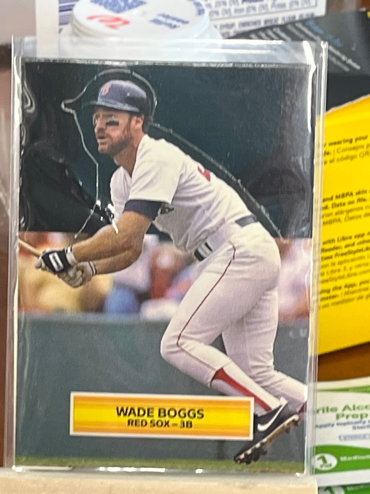 This is a standard sized (2.5" x 3.5") 1991 Score baseball trading card featuring Hall of Famer Wade Boggs of the Boston Red Sox. The card showcases a high-action, full-color photograph of Boggs following through on a swing, appearing in his classic era home white uniform with navy and red accents. Distinctive for the 1991 Score set, the card uses a modern 'full bleed' style photograph that extends to the edges without a traditional white border. At the bottom, a yellow and orange rectangular nameplate identifies the player as 'WADE BOGGS' and his position/team as 'RED SOX - 3B'. The image features a white outline around Boggs' upper body, a design choice meant to make the player pop against the dark stadium background. The card is currently housed in a clear protective plastic sleeve (top loader) which shows some superficial light scratching and reflections from the overhead light. The card itself appears to be in mid-grade condition; notable issues include visible 'chipping' or white wear along the top black edge where the ink has flecked off the card stock, a common issue with dark-bordered cards from this era. The corners show slight softening, particularly at the bottom left. The centering appears slightly heavy towards the right side. The reverse of this card, although not visible, would typically contain career statistics and biographical information on a green and white background.