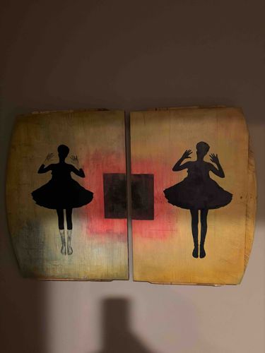 This contemporary artwork consists of two distinct, rectangular panels that feature a slight convex curvature, suggesting they may be crafted from reclaimed barrel staves or specialized bentwood. Each panel depicts a black silhouette of a female figure in a tutu-like dress with hands raised, rendered in a graphic, stencil-like style. The background is a complex, textured mix of muted gold and ochre tones, accented with atmospheric washes of crimson and hints of teal. A dark, centered square spans the gap between the two panels, creating a visual bridge. The construction utilizes thick wooden substrates with visible grain and raw, slightly irregular edges, particularly at the top and bottom. There are signs of intentional distressing, including scuffs and uneven application of pigment to enhance an aged, industrial aesthetic. The figures on the left and right panels differ slightly—the left figure features transparent, line-drawn legs, while the right figure is fully solid black. The overall style is a blend of modern street art and folk-art sensibilities, likely dating from the 21st century. No visible signature is apparent on the face, though the craftsmanship suggests a deliberate studio production with attention to surface texture and depth.