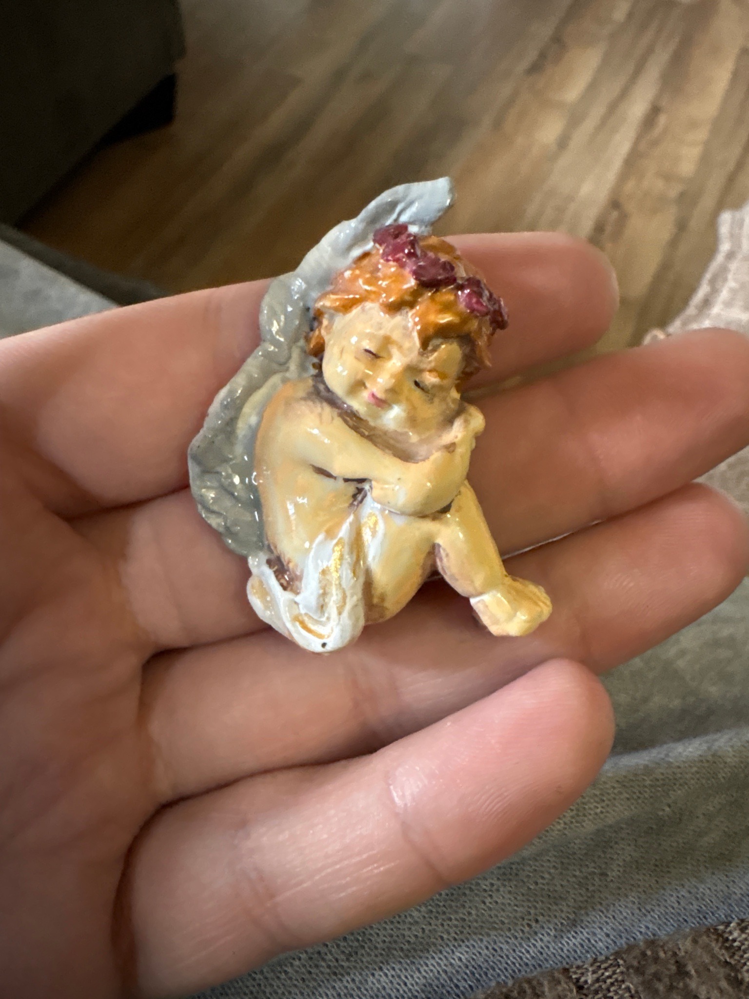 This small, hand-painted figurine is crafted from clay and depicts a sleeping or resting cherub (putto) seated in a curled position. The item measures approximately two inches in height, fitting comfortably in the palm of a hand. The construction features a glossy glaze finish over a pale, flesh-toned body with highlights of white and shadows of light brown to provide depth to the musculature. The cherub has reddish-brown hair adorned with a crown of dark red or maroon flowers. A single, stylized greyish-white wing is visible on the figure's right side, featuring molded textural details to simulate feathers. The facial features are delicate, with closed eyes, a small nose, and a slight pink tint to the lips. The object displays some minor condition issues typical of aged ceramic, including small surface abrasions and potential crazing in the glaze, though no major chips or fractures are immediately structural. There are no visible maker's marks or stamps on the front surface, suggesting it may be part of a boutique artisanal series or a mid-20th-century decorative collectible. The style is reminiscent of neo-classical or sentimental Victorian-revival religious giftware, likely dating from the 1960s to the 1980s.