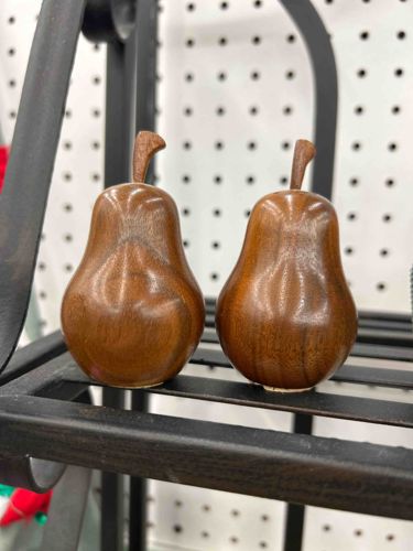 A pair of decorative hand-turned wooden sculptures carved in the likeness of Bosc or Anjou pears. These pieces are crafted from a dense, medium-toned hardwood, likely teak, walnut, or monkey pod wood, exhibiting a rich, warm brown color with visible, attractive grain patterns including subtle 'cathedraling' on the bulbous bodies. Each pear stands approximately 4 to 5 inches tall and features a distinctively carved, angled stem that appears to be integrated into the main body or expertly dowelled for structural integrity. The finish is a smooth, low-to-mid-sheen varnish or oil that enhances the natural chatoyancy of the wood grain. Notably, these pears feature flat circular bases that elevate the fruit slightly, a design hallmark often seen in Mid-Century Modern kitchenware and tabletop decor from the 1960s or 70s. The craftsmanship is of high quality, demonstrating symmetrical turning and smooth transitions from the neck to the base. Condition appears excellent with no visible cracks, chips, or significant scuffing. There is a slight patina suggestive of age, but the wood retains a healthy moisturizing luster. While no maker's mark is visible in the primary view, these are stylistically consistent with Scandinavian or high-end Japanese export woodwares of the mid-20th century.