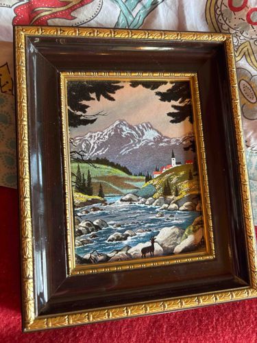 A high-quality vintage decorative miniature featuring a fine woven silk tapestry, likely produced by the German company Ney (STN) in the mid-20th century. The artwork depicts a classic European Alpine landscape, characterized by snow-capped peaks, a rushing river with rocky banks, a small mountain village with a church spire, and a solitary deer in the foreground. The piece is notable for its intricate mechanical weaving technique, which simulates a three-dimensional depth and utilizes a vibrant palette of blues, greens, and earth tones. The tapestry is housed in a substantial wooden frame with a dark mahogany-look finish and gadrooned gilt (gold-leaf style) inner and outer borders. The construction suggests an era ranging from the 1950s to the 1970s. The condition appears excellent with no visible fraying to the silk, though minor surface dust is present. The frame shows light age-related rubbing on the raised gilt edges but remains structurally sound. The craftsmanship exemplifies the detailed decorative souvenirs popular in the post-war European tourism market, specifically from the Alpine regions of Germany, Austria, or Switzerland.