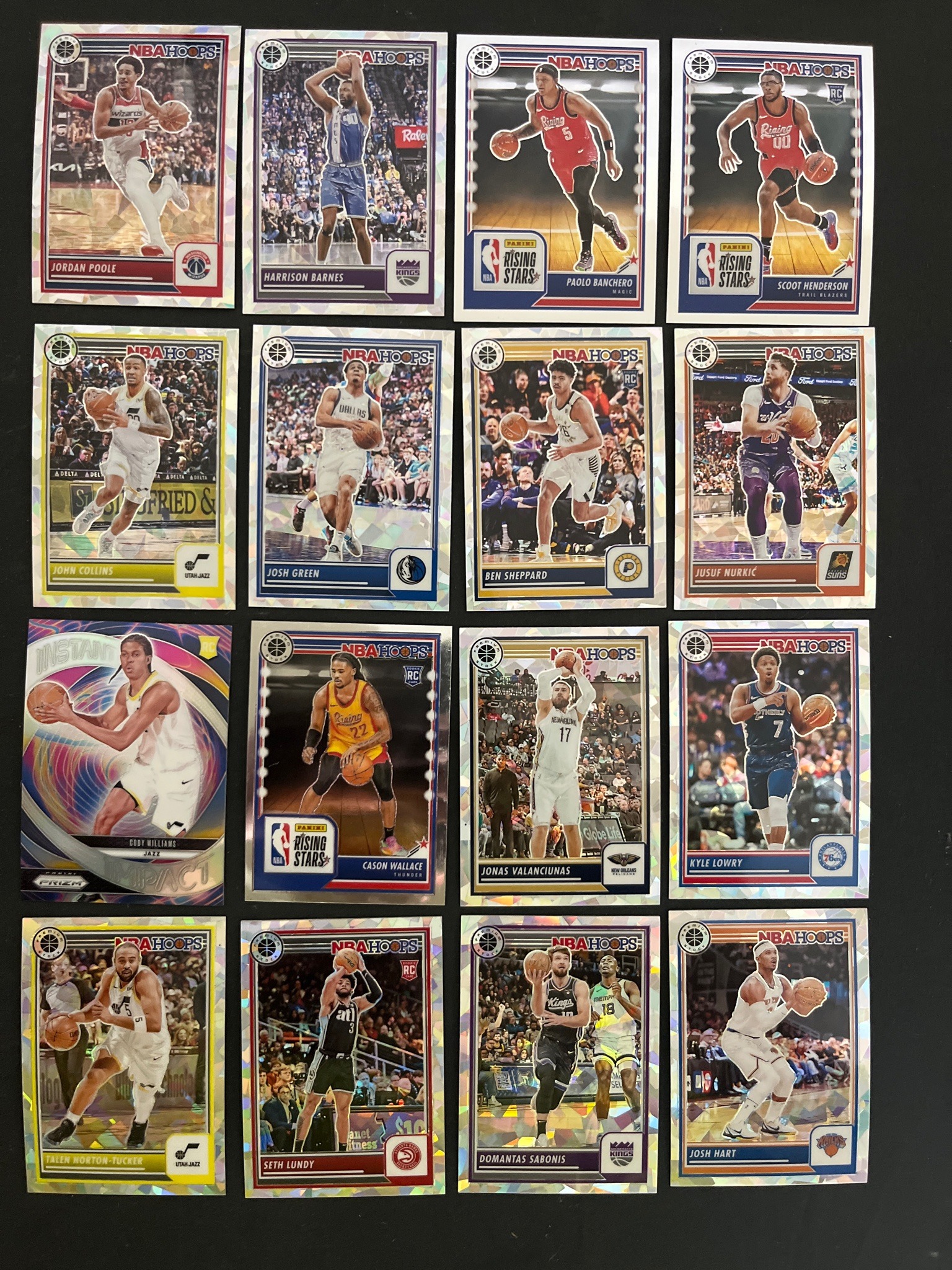 A collection of 16 modern basketball trading cards featuring NBA players, primarily from the Panini NBA Hoops Premium Stock series. The lot includes various card types such as standard player cards, 'Rising Stars' inserts, and 'Instant Impact' subsets. Notable featured players include Paolo Banchero, Scoot Henderson, Jordan Poole, and Josh Hart. Each card is standard size (2.5 by 3.5 inches) and is constructed from heavy-duty cardstock with a high-gloss, holographic 'Premium Stock' finish. This mosaic or cracked-ice refractor pattern provides a multi-colored shimmer when exposed to light. Notable markings include the 'NBA Hoops' logo, the 'RC' rookie card shield on specific players like Scoot Henderson and Ben Sheppard, and team-specific logos. The cards appear to be in excellent to near-mint condition with crisp corners, straight edges, and no visible surface scratches or creases. The centering appears consistent across the lot. These cards represent the contemporary era of sports collectibles, emphasizing high-production quality and shiny parallel finishes popular in the 2023-2024 season marketplaces.