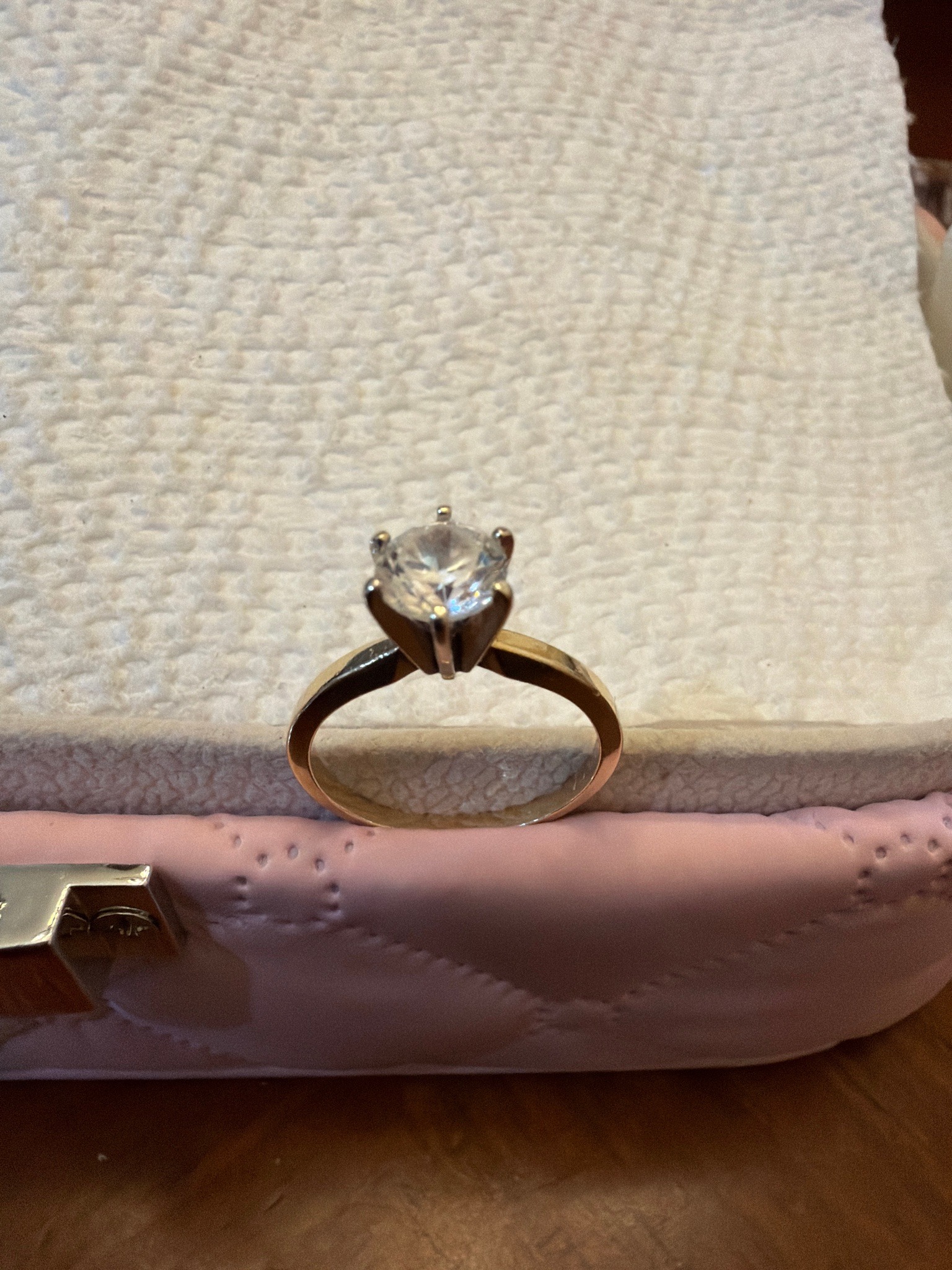 This item is a classic solitaire-style ring featuring a single, large round brilliant cut colorless gemstone. The gemstone is securely held in a high-profile, six-prong setting, often referred to as a 'Tiffany-style' mount, which maximizes light entry into the stone for enhanced sparkle. The band is a polished yellow gold shank with a slightly rounded interior and a flat exterior profile, common in late 20th-century to contemporary jewelry design. Based on visual inspection, the stone exhibits strong brilliance and fire, suggesting it is either a high-grade diamond or a synthetic alternative such as cubic zirconia or moissanite. The prongs appear to be made of a white metal, likely white gold or platinum, to prevents the yellow gold from reflecting into the colorless stone. There are no visible maker's marks or hallmarks from this angle, though such stamps would typically be found on the inner circumference of the shank. The condition appears excellent with minor surface micro-scratches consistent with light wear. The craftsmanship shows precise prong alignment and a smooth transition between the head and the shank, indicating professional manufacturing quality.