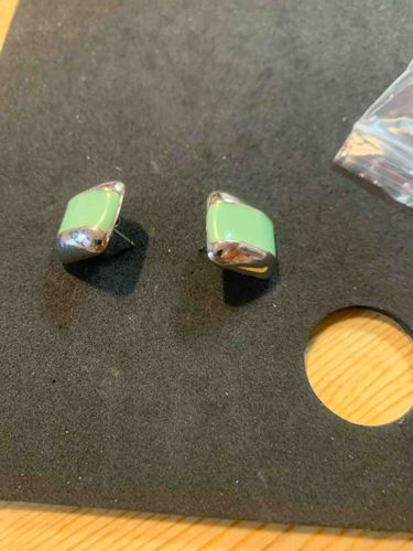 This pair of earrings represents a modernist or mid-century aesthetic, featuring a square-like, softened geometric form with a high-polished metallic finish. Each earring consists of a silver-toned metal base—likely sterling silver based on the high luster and typical construction for this style—that serves as a cradle for a central panel of smooth, opaque enamel. The enamel is a vibrant 'apple green' or mint hue, boasting a glossy, glass-like finish that indicates high-quality application. The metal frame wraps around the edges of the enamel, creating a sleek, integrated look without visible prongs. The shape is slightly domed or convex, adding dimension and allowing the polished surfaces to catch the light from various angles. The earrings are designed for pierced ears, featuring standard straight posts positioned on the reverse. Regarding condition, the metal surfaces show minor micro-scratching consistent with light previous wear, but no deep gouges or significant tarnishing are visible in this view. The enamel appears intact with no immediate signs of cracking, crazing, or loss, suggesting they have been well-maintained. The absence of visible maker's marks from this angle prevents a definitive attribution to a specific designer, though the clean lines are reminiscent of Scandinavian or American craft jewelry from the 1960s or 70s. The overall craftsmanship appears professional, with a flush fitting between the enamel inlay and the metal bezel.