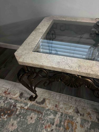 Mediterranean Style Stone and Glass Inset Coffee Table with Wrought Metal Base