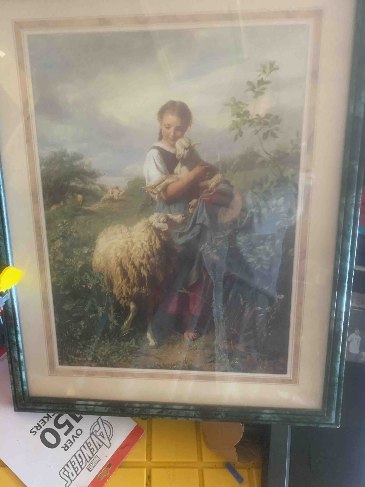 This item is a framed fine art print reproducing a classic 19th-century pastoral scene, most likely 'L'Innocence' or a similar variation by the French Academic painter William-Adolphe Bouguereau. The central image depicts a young girl in rustic, peasant-style clothing—a white blouse, blue apron, and red skirt—cradling a young lamb in her arms while a larger ewe stands by her side. The background features a soft, atmospheric landscape with additional sheep grazing under a cloudy sky. The print exhibits a muted, romanticized color palette characteristic of the Late Victorian or Academic style. It is housed in a decorative, contemporary frame with a faux-marble or verdigris-style green finish. The artwork is protected by glass and features a double-matting with a neutral cream or beige inner border. Regarding condition, the frame shows some minor surface wear, and the glass reflects significant glare, suggesting it is standard rather than museum-quality non-reflective glass. There is no visible artist signature or edition numbering in the provided view, suggesting it is an open-edition mechanical reproduction rather than a hand-signed lithograph. The overall craftsmanship of the framing is professional, and the piece appears to be from the late 20th century.