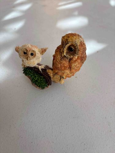 This item is a decorative figurine featuring two owls perched upon a textured branch. The piece is likely constructed from cast resin, a synthetic material frequently used for its ability to mimic fine sculptural details. The larger owl on the right exhibits a reddish-brown or ochre plumage, while the smaller owl on the left features a pale cream and light tan color palette. Both figures are characterized by high-relief texturing that simulates feathers, with large, dark inset eyes that provide a lifelike quality. The owls are positioned on a wood-effect branch that includes a cluster of green foliage at the base, adding organic contrast. Physically, the item appears to be small, approximately 3 to 5 inches in height. Regarding condition, the figurine shows minor signs of surface dust in the crevices of the feather textures and a slight dullness to the finish, consistent with a display piece of mid-to-late 20th-century manufacture. No significant chips, cracks, or structural repairs are visible from the perspective provided. The style is naturalistic and representational, common in mass-produced collectibles from companies like 'Enesco' or 'United Design' during the 1980s or 1990s. The craftsmanship is of standard commercial quality, focusing on aesthetic charm rather than artisanal uniqueness.