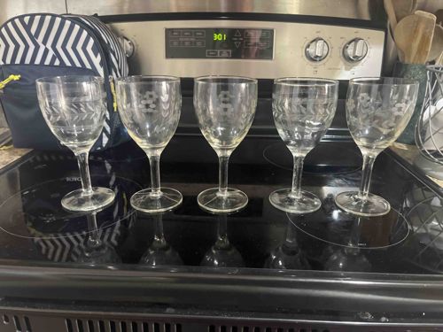 Vintage Etched Floral and Laurel Clear Glass Wine Goblets - Set of 5