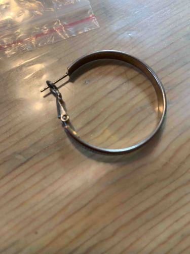 This item is a single hoop earring, characterized by its substantial width and semi-circular geometry. The earring is constructed from a polished metal, likely stainless steel or silver-plated alloy based on the cool luster and visible surface oxidation. It features a 'saddle-back' or 'latch-back' closure mechanism, consisting of a hinged post that snaps into a notched catch on the opposing side of the hoop. The band itself is approximately 4-6mm in width with a flat interior surface and a slightly convex exterior, suggesting a stamped or machined manufacturing process. Regarding condition, there is visible tarnish and dullness across both the interior and exterior surfaces, along with minor surface scratches consistent with regular wear and friction. The hinge appears intact, though the post shows slight misalignment common in mass-produced fashion jewelry. No visible hallmarks or maker's marks are discernible in the image, indicating it is likely a contemporary, commercially manufactured piece of costume jewelry rather than high-end fine jewelry. The style is classic and minimalist, typical of late 20th to early 21st-century fashion trends.