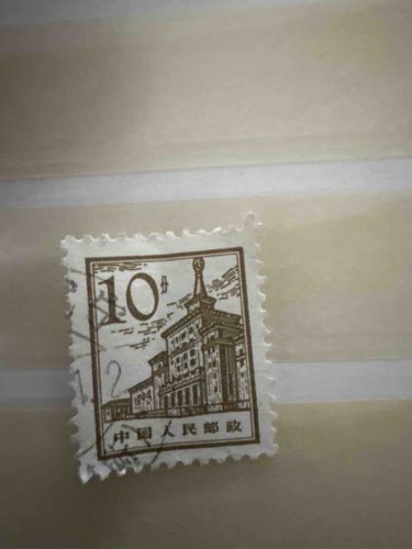 This is a single postage stamp from the People’s Republic of China, issued in 1955. The stamp features an intaglio-printed architectural illustration of the Beijing Soviet Exhibition Center (currently the Beijing Exhibition Center), rendered in a monochromatic sepia/brown ink on off-white paper. The design prominently features the tower of the center topped with a red star and spire, a classic example of Stalinist architecture influential during that period. The denomination '10分' (10 Fen) is located in the upper left corner, while the bottom border contains the Chinese characters '中国人民邮政' (China People's Post). Physically, the stamp measures approximately 22mm by 26mm and features standard perforations. Notably, this specimen is in 'used' condition, evidenced by a partial circular black cancellation mark (postmark) on the left side, though the date and location are not fully legible. The condition shows minor issues typically associated with age and handling: the paper displays slight toning (yellowing), and there is some visual softening of the perforation teeth, particularly at the corners. There are no obvious tears or creases visible from the face, and the ink remains crisp with high-contrast fine lines characteristic of late 1950s Chinese engraving quality. This stamp represents the R10 'Architecture' definitive series, which highlighted newly constructed pride-of-state buildings in the early years of the PRC.