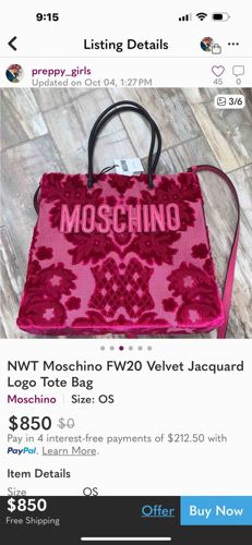 Moschino FW20 Velvet Jacquard Logo Tote Bag