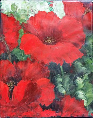 This is a contemporary expressionist oil floral painting executed on a rectangular canvas. The artwork features a vibrant close-up study of red poppies, characterized by a deep, saturated palette of crimson and scarlet against a dark, forest-green background. A primary physical characteristic is the heavy impasto technique, where thick layers of paint have been applied to create substantial physical texture and topographical depth on the petals and foliage. The central poppy dominates the composition, displaying a detailed, dark seeded center with radiating brushstrokes that simulate the delicate ribbing of petals. In the lower-right quadrant, the leaves are rendered with swirling, rhythmic brushwork in shades of sage and emerald, suggesting movement and organic form. The painting appears to be finished with a high-gloss varnish, which enhances the color depth but also creates significant surface glare. While no artist signature is visible on the front, the style suggests a late 20th to early 21st-century contemporary piece. The condition is generally good, though there is some notable glare from the protective finish and possible minor dust accumulation in the deep texture of the impasto ridges. There are no visible signs of canvas warping or paint flaking, indicating a well-preserved surface. The lack of a frame in the image suggests it may be a gallery-wrapped canvas intended for modern display.