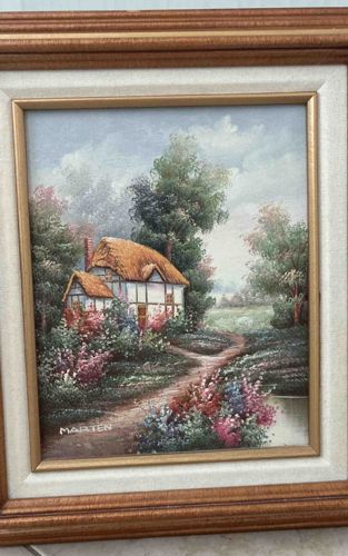 This is a rectangular landscape oil painting on canvas or board, depicting a classic English countryside scene with a thatched-roof cottage as the central focus. The artwork features a palette of greens, soft blues, reddish-browns, and vibrant pinks for the floral landscaping. The cottage is rendered with timber-framing details and a prominent terracotta-colored chimney. The painting is signed in the lower left corner with the name 'MARTEN' in white block lettering. The composition includes a winding dirt path leading past a lush garden towards the cottage, set against a backdrop of dense trees and a cloudy, impressionistic sky. The style is decorative and representative of late 20th-century commercial landscape art, often sold in galleries or decor shops during the 1970s or 1980s. The piece is housed in a triple-layered frame: an outer molded wood-tone frame, a cream-colored fabric or linen-textured liner, and a thin gold-toned inner fillet. The condition appears to be good with no visible craquelure, paint loss, or staining on the liner. The frame shows minor superficial wear consistent with age. This work demonstrates standard wet-on-wet technique popular in mid-to-late century amateur and commercial landscape painting.