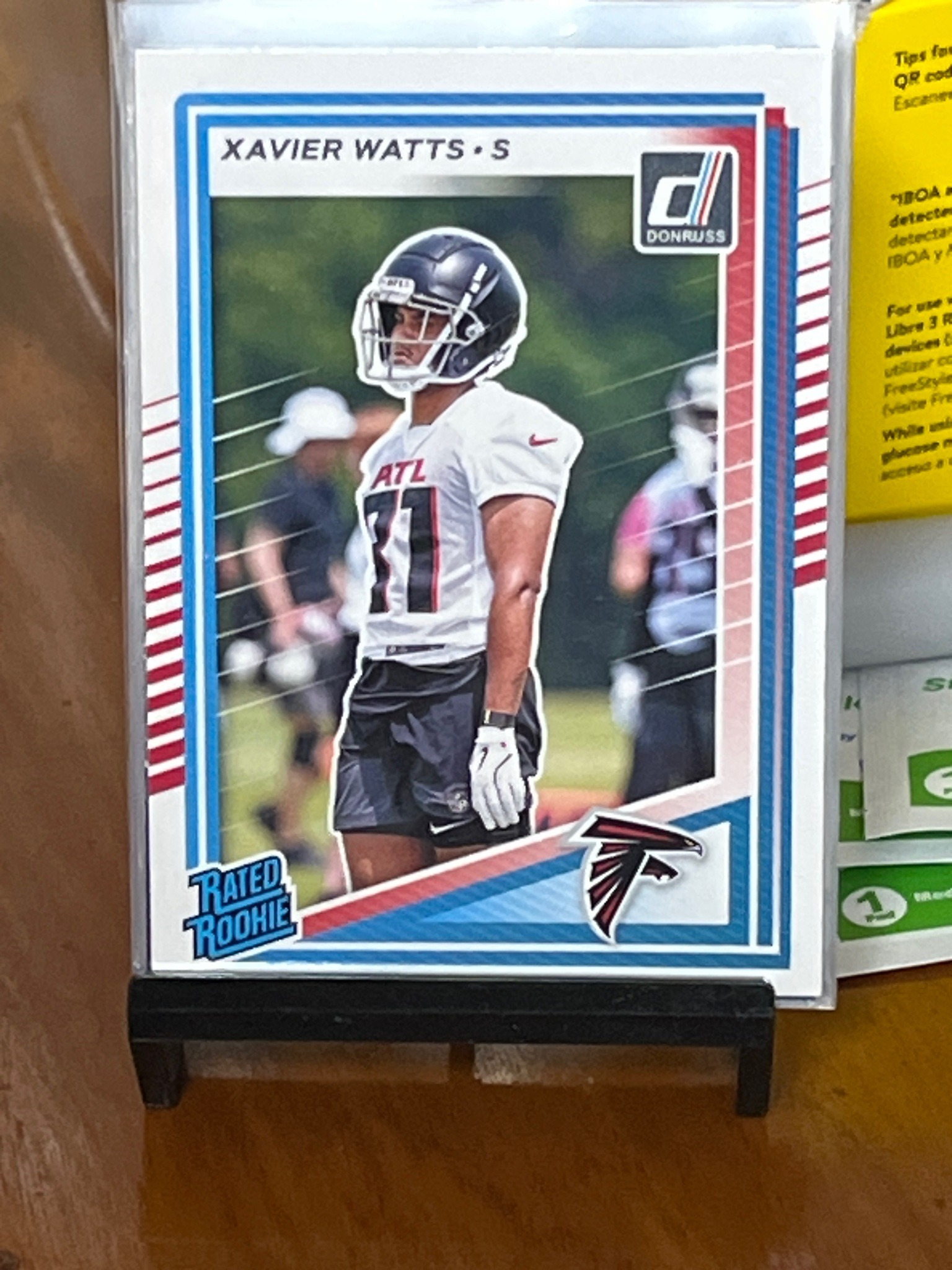 This is a modern sports trading card featuring Xavier Watts, a safety for the Atlanta Falcons. The card is a 'Rated Rookie' edition part of the Panini Donruss product line. The design features a white cardstock base with a prominent blue border and red diagonal accents on the left and right sides. The central image shows Watts in a practice uniform consisting of a black helmet, a white Atlanta Falcons jersey with number 31, and black shorts. The 'Donruss' brand logo is visible in the top right corner, while the iconic 'Rated Rookie' logo is positioned at the bottom left. The Atlanta Falcons mascot logo is featured in the bottom right corner. The name 'XAVIER WATTS • S' is printed at the top of the central image frame. Physically, the card appears to be in a standard 2.5 by 3.5-inch size, housed within an protective plastic card sleeve and top-loader. The centering appears slightly heavy toward the left border. The surface shows high-gloss finish typical of modern Panini prints. No major structural damage like creases or bent corners are visible from this angle, though microscopic surface scratches are common for this type of card stock. The card is being displayed on a small black stand.