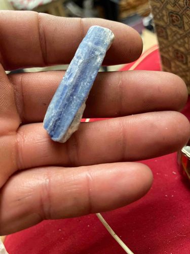 This item is a natural, raw specimen of Blue Kyanite, characterized by its elongated, bladed crystal habit. The specimen measures approximately 1.5 to 2 inches in length and displays a vibrant range of blue hues, from pale sky blue to deep indigo, with characteristic pearly to vitreous luster. Structurally, the crystal exhibits well-defined longitudinal striations and perfect basal cleavage, typical of the aluminosilicate mineral group. Significant white quartz or matrix inclusions are visible at the base and along several edges, providing a sharp color contrast against the blue silicate. As a raw mineral specimen, its condition is natural; there are visible jagged fractures at the terminations, which are expected in unpolished kyanite due to its anisotropic hardness (varying significantly depending on the crystallographic direction). No synthetic treatments or dyes are immediately apparent. The craftsmanship is entirely geological, showcasing high-quality natural crystallization with no evidence of lapidary modification. Such specimens are commonly sourced from metamorphic rock regions in Brazil and are highly valued in mineral collections for their distinct color and geometric crystal formations.