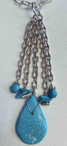 This necklace features a modern southwestern-inspired tassel pendant crafted from sterling silver and turquoise. The centerpiece is a large, polished teardrop-shaped turquoise cabochon with a vibrant blue-green hue and subtle white to light-grey matrix inclusions. This central stone is top-drilled and secured with a hand-wrapped silver wire bail. Suspending the pendant are four cascading lengths of round-link sterling silver cable chain of varying lengths. Interspersed among the chains are accent beads, including round polished turquoise beads, small turquoise chips (heishi style), and tiny silver spacer beads with a granulated or beaded texture. The craftsmanship utilizes jewelry-making techniques such as wire wrapping around headpins to secure the smaller stones. The sterling silver exhibits a bright finish with very light surface oxidation common in pre-owned jewelry, but no major signs of damage or repair are visible. The overall aesthetic suggests a contemporary artisanal or 'boutique' style, likely produced within the last 20 years. The combination of the heavy gauge chains and the substantial central teardrop stone indicates a piece of moderate weight and durable construction.