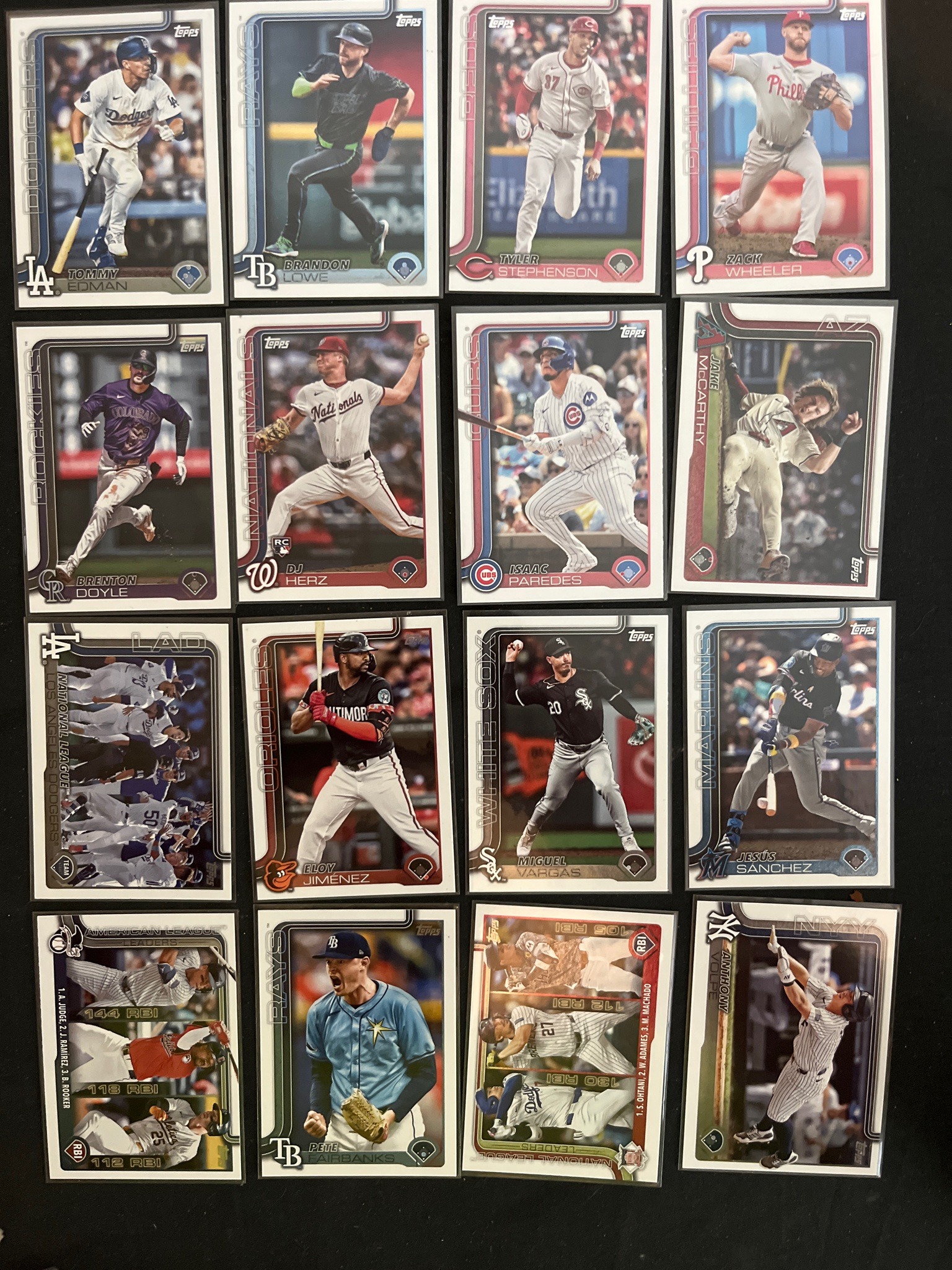 This is a collection of 16 modern baseball trading cards from the 2024 Topps Series. The set includes a mix of base cards, rookie cards, and statistical leader cards. Notable players featured include Tommy Edman, Zack Wheeler, Anthony Volpe, and a National League RBI leaders card featuring Shohei Ohtani. Each card measures approximately 2.5 by 3.5 inches and is printed on standard semi-gloss cardstock with high-definition action photography. The card design is characterized by the 2024 Topps 'neon-style' borders that vary in color (blue, red, orange, black) to match individual team palettes. The Topps logo is clearly visible in the top corners, and team-specific logos are positioned at the bottom. One card, DJ Herz, features the 'RC' (Rookie Card) shield, increasing its specific collectibility. Each card is currently housed in an individual clear plastic protective sleeve (penny sleeve). The visible condition appears excellent, likely Near Mint to Mint, with sharp corners, clean edges, and no obvious surface scratches, creasing, or fading. The printing quality is high, exhibiting vibrant colors and proper registration typical of modern mass-production sports cards. This grouping represents contemporary sports memorabilia from a reputable manufacturer with a history dating back to the mid-20th century.