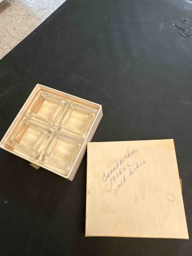 This is a set of four square-shaped individual glass salt cellars, commonly referred to as salt dips, housed in their original (likely aftermarket or handwritten) storage box. Each piece is crafted from clear, colorless pressed glass featuring a classic square architectural form with straight walls and a recessed interior well designed to hold fine table salt. The glass exhibits the characteristic clarity and weight associated with mid-century American pressed glass production. Based on the handwritten notation on the box cover which reads 'Grandmother McKee salt dishes,' these are attributed to the McKee Glass Company. Each individual dish measures approximately 1.25 to 1.5 inches square. The style suggests a production period from the early to mid-20th century. Notably, the set appears to be in excellent vintage condition with no visible chips, flea bites, or significant scratching on the glass surfaces. The original box lid shows significant age-related wear, including yellowing/toning of the paperboard, some light staining, and handwritten cursive script in blue or black ink. This provenance through the handwriting adds a personal historical layer to the set, though it suggests the box has served as a long-term storage solution rather than a decorative retail display. The craftsmanship is typical of high-quality mass-produced utilitarian glass of the era, prioritizing durability and clean geometric lines.
