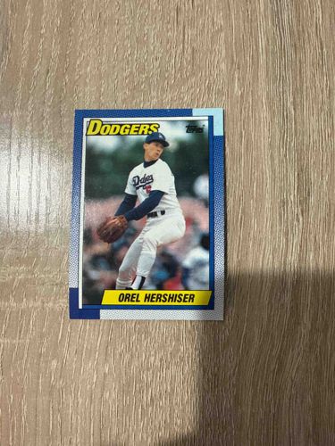 This is a standard 2.5 by 3.5 inch trading card featuring Los Angeles Dodgers pitcher Orel Hershiser. Produced by Topps in 1990, the card features a distinctive design with a light blue and white speckled border, a dark blue inner frame, and high-contrast yellow banners for the team name 'Dodgers' and the player's name 'Orel Hershiser'. The central image shows Hershiser in a pitching follow-through motion wearing the classic white home Dodgers uniform. Notable features include the 1990 Topps logo in the upper right corner of the photo frame. The card is printed on characteristic thick cardstock from the 'junk wax' era. In terms of condition, the centering appears shifted slightly toward the top and right. The corners show some minor softening, particularly at the bottom left. The surface finish is typical of the era, reflecting slight gloss but exhibiting some of the graininess common in 1990 high-volume printing. There are no visible creases or major stains, suggesting it has been kept in a protective environment. This specific card captures a Hall of Fame caliber player during the peak of his career following his legendary 1988 season.