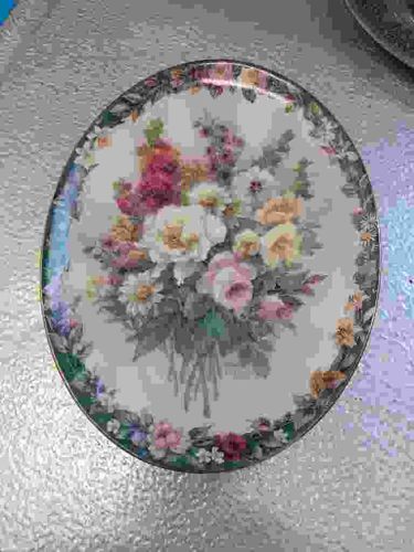This is a fine ceramic or porcelain oval-shaped serving platter featuring a multi-tonal floral motif. The central design depicts a lush bouquet of various garden flowers, including pink and white roses, daisies, and yellow blooms, rendered in a traditional botanical illustration style. The color palette is varied but soft, utilizing shades of burgundy, coral, pink, yellow, and various greens for the foliage. The rim is decorated with a continuous floral border that mirrors the central bouquet's motifs, framed by a delicate gold or dark glaze thin edge. Proportionally, the platter follows classic Victorian or mid-century English pottery styles. The construction appears to be a slip-cast ceramic with a high-gloss glaze finish over transfer-printed decals. In terms of condition, the surface shows a slight sheen consistent with well-maintained porcelain, though there is potential light kiln-dust under the glaze or minor surface scratches typical of shelf wear. The craftsmanship suggests a commercial production run from the mid-20th century, likely from a European or American pottery house such as Royal Worcester or Johnson Brothers. The lack of visible manufacturer backstamps in the primary photo prevents a definitive attribution, but the quality of the transfer print indicates a standard of mass-market luxury common in the 1950s-1970s.