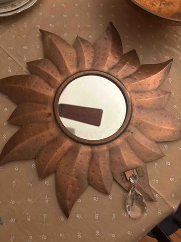 This decorative wall mirror features a sunburst or 'sunstar' design, crafted from thin sheet metal, likely copper or copper-plated steel, given its warm, reddish-brown metallic hue. The frame consists of a circular central mirror plate surrounded by twelve points that resemble petals or sun rays. Each point is meticulously textured with a hammered or dimpled pattern, adding depth and shadow to the surface. The construction appears to be machine-pressed or hand-formed metal with a matte, aged finish. A notable and unusual feature is a large, faceted crystal-style glass droplet suspended from a bracket on the lower right petal, which may be a later addition or a specific design element intended to catch and refract light. The item shows signs of age include slight surface oxidation, darker spots or patina consistent with mid-20th-century decorative items, and some dust accumulation in the crevices. Its style is evocative of the Brutalist or Hollywood Regency movements commonplace in the 1960s or 1970s. The quality indicates a mass-market decorative piece rather than a high-end designer original, although the presence of the crystal pendant adds a unique flair. There are no visible maker's marks on the front, and the condition appears fair to good with no major structural damage apparent in the photograph.