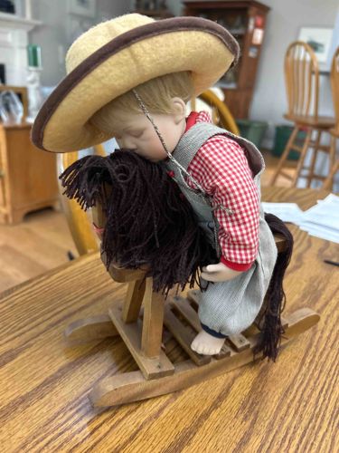 This collectible vignette features a young boy porcelain doll resting his head atop a miniature wooden rocking horse. The doll is designed with an 'asleep' expression, featuring closed eyes with delicate eyelashes and hand-painted facial details including soft blushing on the cheeks and lips. He is dressed in a Western-themed outfit consisting of a red and white gingham checkered shirt, grey fabric overalls with fine pinstripes, and a wide-brimmed tan felt cowboy hat with chocolate brown trim and a silver-toned chin string. The doll's head, hands, and bare feet appear to be crafted from matte-finish bisque porcelain, while the body is likely soft-stuffed fabric to allow for the seated pose. The accompanying rocking horse is constructed of plain-finish stained wood with a simple, rustic design. It features a dark brown yarn mane and tail, adding a tactile element to the piece. The overall construction implies it is a decorative item rather than a toy, typical of the mass-produced porcelain collector dolls popular in the late 1980s through the 1990s. Condition appears good with no visible chips or cracks to the porcelain, though there is minor fraying on the yarn and slight dust accumulation on the felt hat. There are no immediate visible maker's marks or signatures, though typically such dolls had tags or neck stamps which are obscured here.