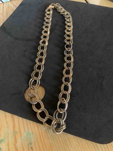 This item is a vintage-style chunky link necklace, characterized by a double-linked curb chain construction. The piece is crafted from a gold-tone base metal, possibly brass or gold-plated alloy. Each individual link consists of two intertwined oval rings, creating a layered and textured appearance. One ring in each set appears to have a subtle fluted or ribbed texture, while the companion ring is smooth, adding visual interest through contrasting finishes. The necklace measures approximately 16 to 18 inches in length, sitting at the collarbone. It features a lobster claw or spring ring clasp for closure, which appears functional. The overall condition shows signs of age-appropriate wear, including minor surface scratches and slight tarnishing or loss of the gold plating in high-friction areas, revealing a darker base metal underneath. This type of costume jewelry was popular during the mid-to-late 20th century, specifically the 1970s and 1980s, known for bold, statement-style accessories. The links are uniform in size and weight, indicating mass-production rather than artisanal hand-casting. No visible maker's marks or signatures are identifiable from the image, but the design is consistent with brands like Monet, Trifari, or Napier. Despite the wear, the structural integrity of the chain remains sound, and the patina provides a distinctive vintage aesthetic.