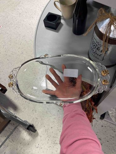 This item is an oval-shaped serving tray or bowl, likely crafted from heavy, pressed clear glass. It measures approximately 12 to 14 inches in length including the handles. The piece features a deep, smooth central well with a thick, rounded rim that suggests durability and quality. A defining characteristic is the ornate, scalloped glass handles on each end, which are decorated with molded floral or leaf motifs. These floral elements have been accented with metallic gold gilding (gold flash), adding a mid-century decorative flair. The style is reminiscent of glassmakers such as Indiana Glass or Mikasa from the mid-to-late 20th century. The glass displays high clarity with minimal visible bubbling, indicating a decent manufacturing standard. Notably, there is a white rectangular price tag or inventory label affixed to the interior center. Condition-wise, the glass appears free of major cracks or chips, though the gold gilding on the handles shows signs of slight wear or thinning, typical of age and washing. This piece serves as a functional yet decorative serving dish for hors d'oeuvres or as a tabletop center bowl.