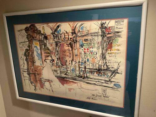 This item is a framed, limited edition artistic print titled 'The Stag’s Head' by the renowned American artist Leroy Neiman. The artwork depicts the interior of the historic Stag’s Head pub in Dublin, Ireland, executed in Neiman's signature expressionistic style—characterized by energetic, fluid line work and vibrant splashes of color. The piece features a man in profile at the bar, surrounded by the intricate Victorian architectural details of the pub, including ornate woodwork, Guinness branding, and whiskey signage. The medium appears to be a serigraph or high-quality lithograph on heavy paper. It is housed in a modern white frame with a teal-blue overmat and a thin red inner mat, providing a bold contrast to the sketch-like quality of the art. Notable markings include the title 'THE STAG'S HEAD' in the lower right margin, accompanied by LeRoy Neiman’s distinctive signature and likely a pencil-written edition number. The condition appears excellent with no visible foxing, water damage, or fading of the pigments, though the frame has minor edge wear. The loose, gestural brushwork and bright primary accents are typical of Neiman’s late 20th-century output, reflecting high-quality commercial craftsmanship and artistic prestige.