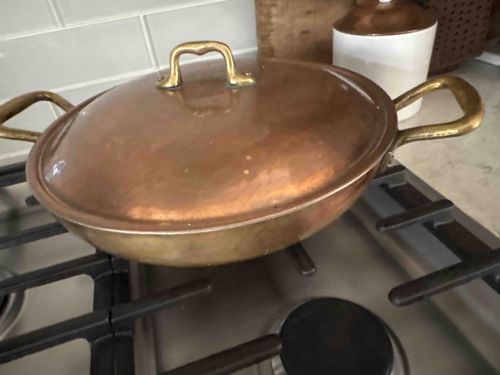 Vintage Covered Copper Rondeau/Sauté Pan with Brass Handles