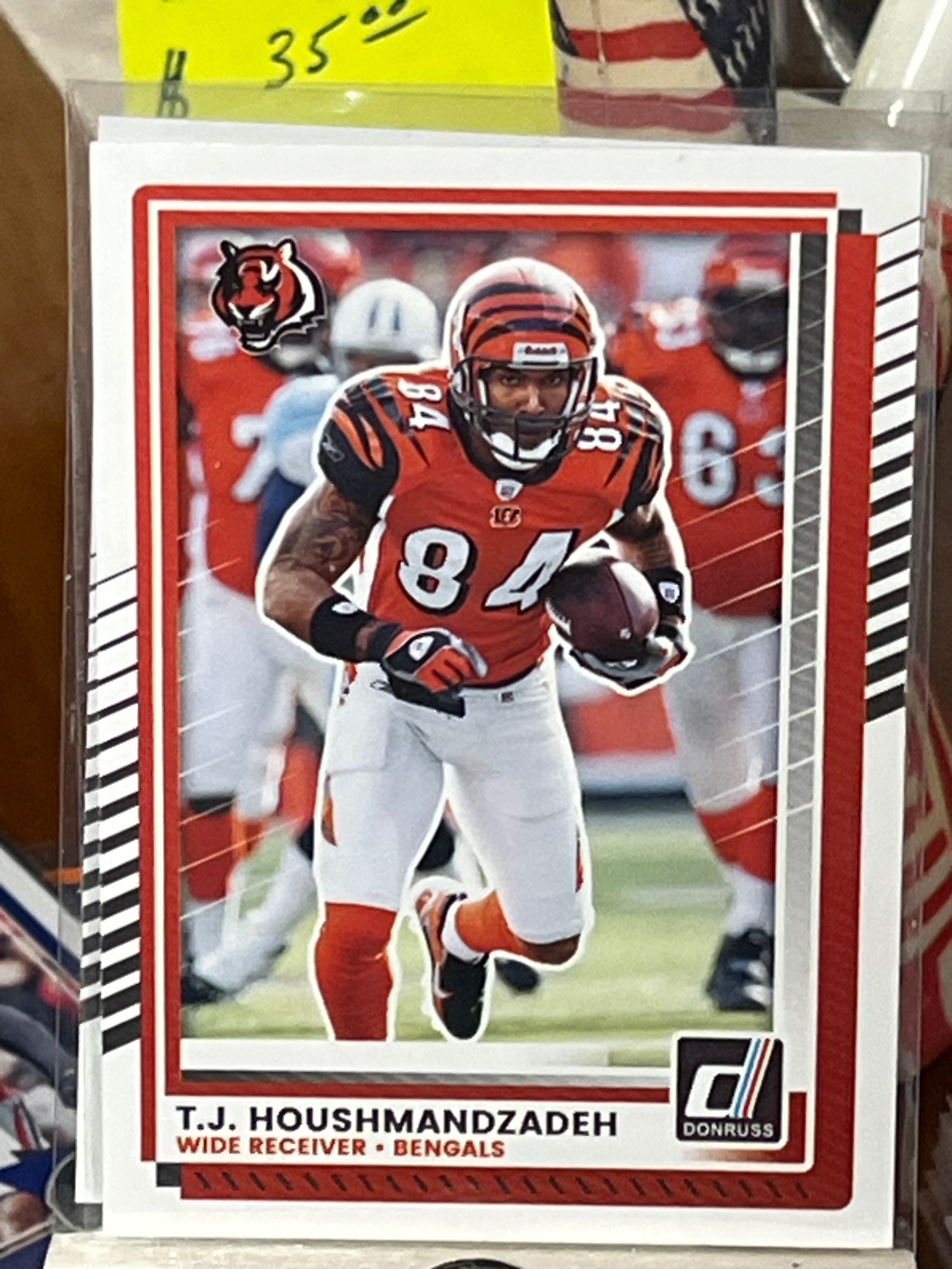 This is a modern sports trading card featuring former Cincinnati Bengals wide receiver T.J. Houshmandzadeh, designed in a 'Retro Series' style. The card follows a standard 2.5 by 3.5-inch rectangular format, printed on mid-weight glossy cardstock. The design features a prominent white border with nested red and black accent lines. The central image shows an action shot of Houshmandzadeh (player #84) in full Bengals home uniform—orange jersey and striped helmet—carrying a football. A Cincinnati Bengals tiger logo is located in the upper left corner of the image frame. The bottom section of the card contains a white bar with the player's name and position printed in bold black serif and sans-serif fonts. In the bottom right, the 'Donruss' logo with three colored diagonal stripes is visible. The card is currently housed in a clear protective plastic top-loader sleeve, which has a yellow price tag of '35.00' visible at the top edge. The condition appears excellent with sharp corners and clean edges, showing no visible surface scratches, creasing, or fading. This particular series is manufactured by Panini America under the Donruss brand, utilizing nostalgic graphic elements from 1980s or 90s designs while featuring modern player photography.