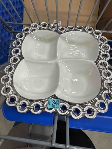 This item is a contemporary square-shaped ceramic relish or snack server featuring four distinct deep-well compartments separated by an integrated central divider. The piece is finished in a high-gloss white glaze on the interior surfaces, providing a clean, sanitary aesthetic for food service. The most defining characteristics is the wide, decorative border featuring an interlocking open-loop chain link motif finished in a metallic silver or chrome-like electroplated glaze. The overall footprint is approximately 10 to 12 inches square. The craftsmanship indicates a mass-market contemporary origin, likely late 20th or early 21st century, designed for modern home entertaining. Condition-wise, the piece appears to be in good used condition, showing expected shelf wear on the underside and some minor smudging on the metallic finish. A blue retail thrift store price tag is affixed to the front, which may leave adhesive residue. No visible cracks or major chips are observed in the primary wells, though metallic glazes of this type are prone to micro-scratches and potential delamination if placed in a dishwasher or microwave. It combines a classic white ceramic body with a Hollywood Regency or modern glam flair.