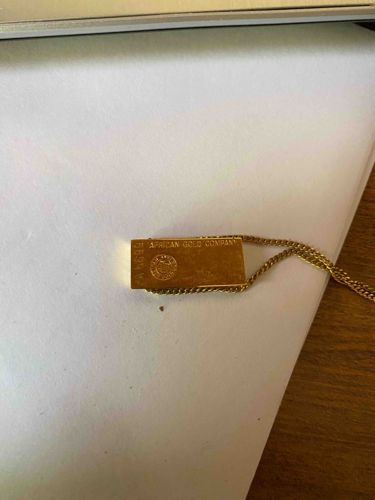 This item is a bullion-style pendant featuring a rectangular gold-tone bar suspended from a matching curb-link chain. The bar bears the embossed text 'AFRICAN GOLD COMPANY' along the top edge, accompanied by a circular seal or hallmark and a serial number 'BB94 V' stamped vertically on the left side. The bar has a high-polish reflective finish and a distinct yellow gold color typical of high-karat gold or gold plating. The construction appears sturdy, with the pendant integrated into the chain via a top-mounted bail or sliding mechanism. In terms of condition, the bar displays minor surface micro-abrasions and light scratches consistent with modern use. No significant dents, deep gouges, or signs of metal fatigue are immediately visible. The craftsmanship demonstrates clean edges and precise mechanical stamping of the letters and logos. Based on the design, this is likely a contemporary jewelry piece, perhaps late 20th to early 21st century, designed to mimic the appearance of a standard investment-grade gold ingot. The overall aesthetic is one of modern luxury, and the presence of a serial number suggests it was produced with specific weight and purity certifications in mind, though the actual metal content would require professional testing to verify.