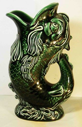 This is a decorative ceramic pitcher, commonly known as a 'gluggle jug' or 'gurgle pitcher,' likely produced by Wedgwood in the late 19th to early 20th century. The vessel is meticulously sculpted in the form of a leaping fish, traditionally modeled after a sea bass or cod. It features a rich, deep emerald green majolica-style lead glaze with darker forest-green or blackish pooling in the recessed areas, which serves to emphasize the highly detailed relief work. The design includes textured scales across the body, flowing fins that double as the handle, and a large open mouth that serves as the pouring spout. The base is ornately decorated with swirling wave motifs, providing structural stability and thematic consistency. The glazing exhibits a high-gloss vitrified finish that appears well-preserved, though typical for its age, one might expect fine micro-crazing upon close inspection. There are no immediate visible signs of major structural chips, cracks, or professional restorations in this view. The interior is likely also glazed in green or a contrasting white. These pitchers are celebrated for the unique gurgling sound they produce when liquid is poured, caused by air trapped in the tail section. This specific forest-green coloration and the sharpness of the mold indicate a high-quality production run characteristic of Victorian-era English ceramics.