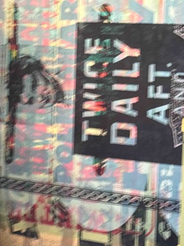 This is a vibrant and complex mixed media artwork, likely a digital print or silk-screen on canvas or a similar rigid substrate. The composition utilizes a heavy layering technique, blending graphic design elements with photographic imagery. A prominent black rectangular block serves as a focal point, containing large, sans-serif typography that reads 'TWICE DAILY AFT.' and 'AND'. The letters are rendered with a 3D drop-shadow effect in shades of blue and white, creating a sense of depth against the dark background. The underlying background is a chaotic mix of red, blue, and yellow hues over what appears to be a monochromatic graphic of a person’s face. A distinctive horizontal band resembling a stylized fence or technical rail cuts across the lower third of the frame. The overall aesthetic is heavily influenced by Pop Art and contemporary street art movements, specifically recalling the techniques of collage artists like Robert Rauschenberg. The condition appears to be relatively contemporary given the crispness of the digital-style rendering, with no obvious signs of significant flaking or structural damage visible in the provided image. The surface texture seems to have a matte finish, with some visible pixelation and dither marks that suggest a modern digital printing process as the primary medium.