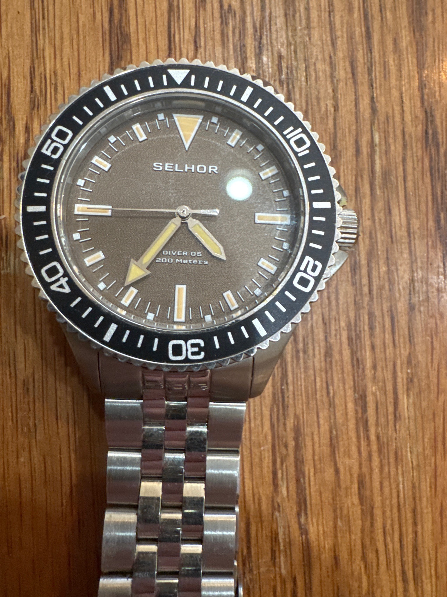 This is a vintage-style Selhor Diver 05 professional dive watch featuring a robust stainless steel construction. The timepiece is characterized by its matte grey-brown dial, often referred to as a 'ghost' or 'tropical' tone, accented with luminous rectangular hour markers and a prominent inverted triangle at the 12 o'clock position. The handset consists of a broad arrow hour hand and a baton minute hand, both filled with aged luminous material that exhibits a creamy yellow patina. The watch is equipped with a unidirectional rotating dive bezel featuring a black aluminum insert with silver-toned Arabic numerals for the 10-minute increments and a luminous pip at the origin. The case is approximately 40-42mm in diameter, showing sharp lugs and a screw-down crown protected by modest crown guards. It is paired with a stainless steel multi-link bracelet, frequently called a 'Jubilee' style, which shows alternating brushed and polished finishes. The dial is printed with 'SELHOR' in white block lettering at the top and 'DIVER 05 200 Meters' at the 6 o'clock position. Condition appears pre-owned with minor surface abrasions on the bezel edge and lugs, consistent with light wear. The craftsmanship reflects a purposeful tool-watch aesthetic likely dating from the late 20th century to contemporary vintage re-issues.