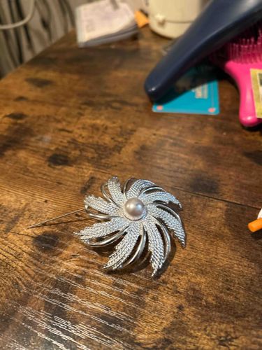 This piece is a classic vintage brooch featuring a mid-century pinwheel or stylized floral design. The item is constructed from a silver-tone base metal, likely rhodium-plated for durability and shine. It measures approximately 2 to 2.5 inches in diameter. The aesthetic is defined by eight curved, feather-like 'petals' originating from a central hub. Each petal displays a sophisticated dual finish: a fine, cross-hatched textured pattern on the inner section and a smooth, polished high-shine finish along the outer edges to create depth and movement. At the absolute center sits a single, cream-colored faux pearl or cabochon with a satin luster, secured in a bezel-style mount. The back features a traditional pinstem with a rolling safety clasp. Judging by the textured metalwork and the specific swirl motif, this piece aligns with the Mid-Century Modern style popular between the 1940s and 1960s. While the user noted a 1930s origin, the use of highly textured silver-tone plating is more characteristic of later costume jewelry giants like Sarah Coventry, Trifari, or Coro. The condition appears excellent with no visible tarnishing or 'green' oxidation, though there is a slight bend in the pinstem, which is common for vintage utility hardware.