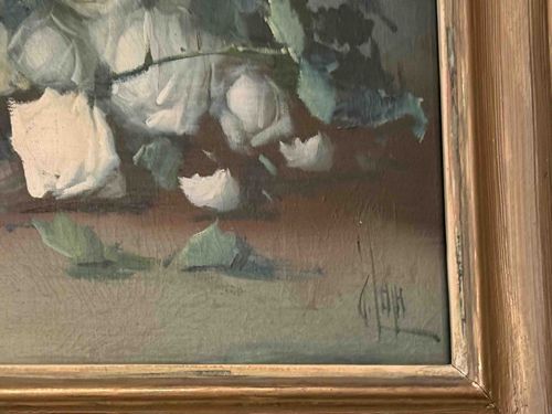 This is an original oil painting on canvas featuring a close-up, impressionistic floral composition, specifically a collection of white or pale roses. The artwork is characterized by high-impasto brushwork, where the paint is applied thickly to create physical texture on the surface, emphasizing the delicate petals and the cool, shadowed leaves. The color palette centers on soft whites, muted greens, and earthy browns, suggesting a Mid-Century or late 20th-century aesthetic. The work is signed in the lower right corner with a stylized signature that appears to read 'G. Goth' in dark pigment. The painting is housed in a carved wooden frame with a champagne or light gold metallic finish, featuring a tiered profile with visible wood grain. Condition-wise, the canvas appears stable with some minor debris or dust accumulation on the heavy impasto sections. The frame shows light age-related wear, including minor scuffing and small nicks along the inner border and outer edges. The overall quality of the brushwork indicates a professional hand with a confident, painterly style focused on light and form rather than fine detail.
