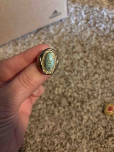 This is a vintage-style ring featuring a prominent oval turquoise cabochon as its centerpiece. The turquoise stone displays a light blue-green hue with a natural-looking brown and tan spiderweb matrix, characteristic of many Southwestern-style jewelry pieces. The stone is set in a secure bezel frame, further accented by a fine, twisted-rope wire border that adds texture and visual interest. The surrounding metal mount is an elongated oval shape with a polished, reflective finish. The ring's shoulders appear to have a slight flare or decorative indentation where the band meets the central setting. Although no hallmarks are visible from this angle, the design and patina suggest it is likely made of sterling silver or silver-plated base metal, consistent with mid-to-late 20th-century Native American-inspired costume jewelry or Fred Harvey Era tourist trade styles. The condition appears fair to good; there is some visible tarnish and surface patina on the metal, which is common in older silver pieces. No significant chips or cracks are immediately evident on the surface of the turquoise stone, though its luster appears somewhat matte, possibly due to natural wear or basic finishing techniques used during manufacturing.