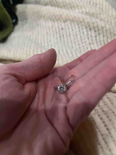 This is a single drop-style earring featuring a large, round brilliant-cut colorless stone. The stone is held in a multi-prong basket setting, likely white gold, platinum, or high-quality sterling silver based on the cool metallic tone. The earring utilizes a leverback closure mechanism, which is a curved wire that hooks into a hinged backing for security. The central stone appears to be approximately 1.0 to 1.5 carats in size, showcasing significant fire and brilliance, though a professional gemological test would be required to distinguish between a natural diamond, lab-grown diamond, or a stimulant like cubic zirconia or moissanite. The setting includes a small decorative link between the wire and the basket, possibly accented with tiny melee stones. The item appears to be in good used condition with no visible chips to the stone or mechanical failure in the hinge. The style is classic and contemporary, modeled after estate jewelry but likely manufactured within the last 20 years. There are no maker's marks visible in the photograph, but such stamps would typically be found on the interior of the leverback wire.