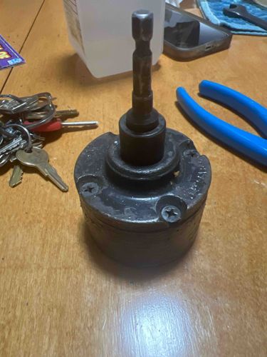 This is a heavy-duty mechanical torque limiting clutch or adapter designed for industrial power tool use. The object features a cylindrical base body made of dark, likely heat-treated steel, assembled with visible Phillips-head screws on the top face. Protruding from the center is a standard 1/4-inch hex shank, which allows the device to be inserted into a standard impact driver or drill chuck. The body shows significant signs of industrial patina, including surface scuffs, grease residue, and minor oxidation consistent with a workshop environment. The construction appears robust, utilizing high-density metals to withstand high rotational force. There are faint manufacturer markings or part numbers stamped onto the top perimeter, though they are partially obscured by wear. The device functions as a safety or precision mechanism to prevent over-tightening of fasteners by slipping once a specific torque threshold is reached. Its weathered state and solid steel construction suggest it is a professional-grade vintage or pre-owned tool accessory from the late 20th century to early 2000s.